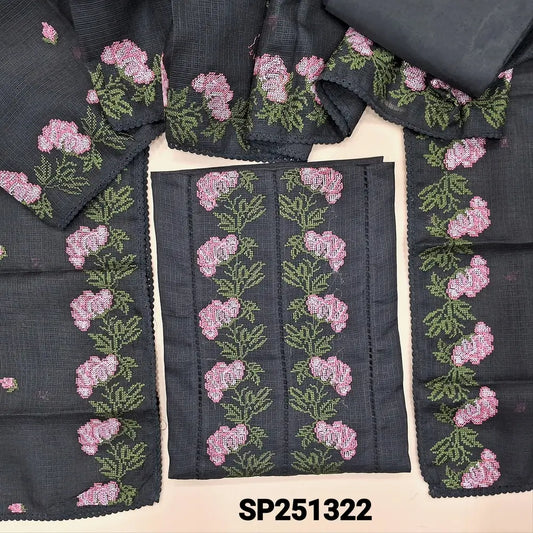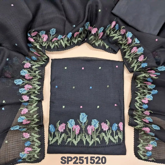 Black floral printed fancy kota silk cotton unstitched salwar material(thin, lining needed)matching silky bottom, fancy kota silk cotton dupatta with gold tissue borders. CODE AG250602