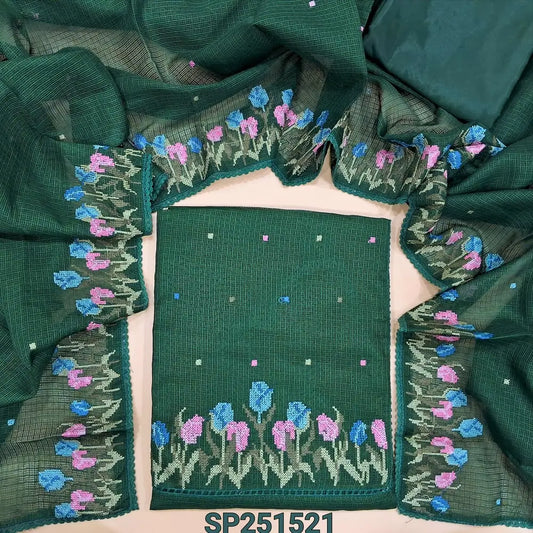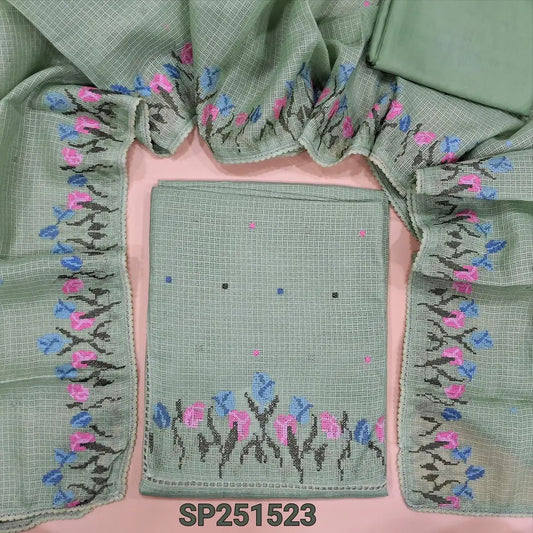 Designer mossy Green tissue kota unstitched salwar material(lining needed) colorful embroidery work on yoke, matching santoon bottom, digital printed tissue silk cotton dupatta with tissue borders.DC250202