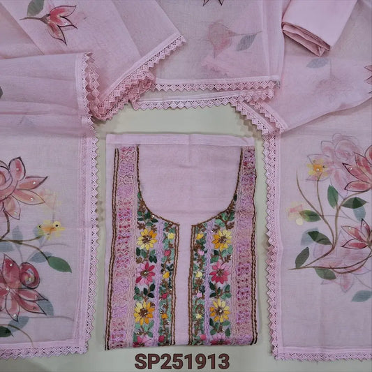 Light Pastel Pink premium supernet unstitched salwar material, Hand embroidery work on yoke (Thin, Lining Needed) Matching drum dyed lining provided, NO BOTTOM, Premium supernet Full Length Dupatta with hand brushpaint and embroidery work. SP251915