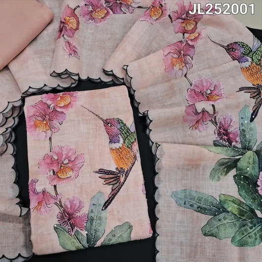 Peachish pink slub organza unstitched salwar material,(thin, lining needed) digital printed, sequence work on yoke and daman, matching santoon bottom, digital printed slub organza dupatta with lace borders. OC251304