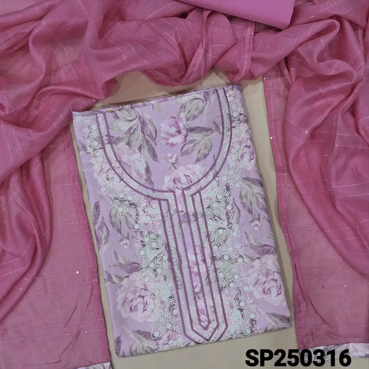 Mauve slub cotton unstitched salwar material, embroidered on yoke(lining needed)matching drum dyed fabric provided for lining, NO BOTTOM, embroidered pure mul cotton dupatta with lace tapings. CODE JL251901