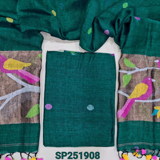 Designer Bottle Green pure linen jamdani unstitched salwar material, Rich weaving on daman (Textured, Lining Needed) NO BOTTOM, Jamdani woven full length dupatta with jamdani weaving on pallu and handmade tassels. NV252802