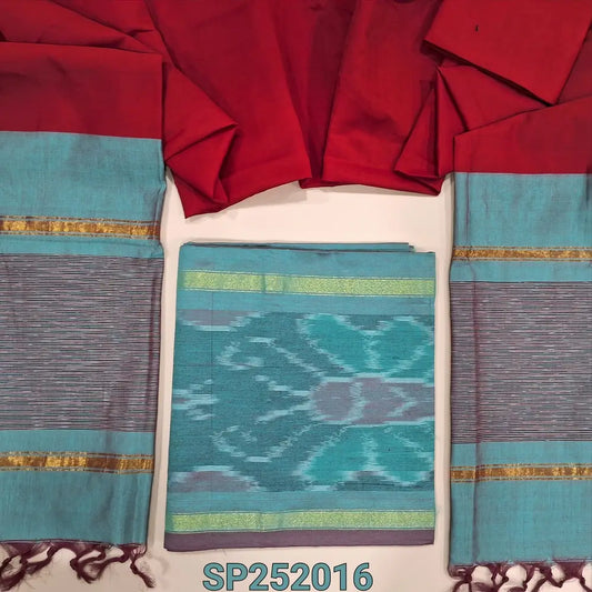 Light Green south handloom cotton unstitched salwar material(lining optional) ikat woven design allover, matching slub cotton bottom, hand block printed kota silk cotton dupatta. Dc250217