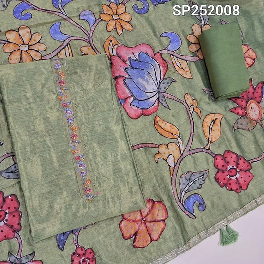Designer mossy Green tissue kota unstitched salwar material(lining needed) colorful embroidery work on yoke, matching santoon bottom, digital printed tissue silk cotton dupatta with tissue borders.DC250202