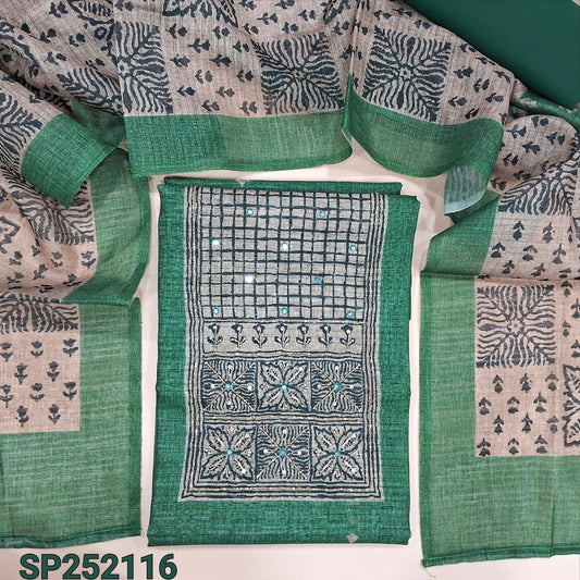 Digital floral printed Green silk cotton unstitched salwar material (thin, lining needed) kantha stitch work on front, green cotton bottom, digital print, kantha stitch work on silk cotton dupatta. DC250702