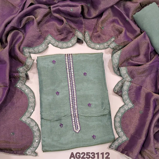 Sage green chiffon organza unstitched salwar material, self embroidered& sequins work on front(thin, lining needed)matching silky bottom, embroidered chiffon organza dupatta with scallop borders. CODE JN253011