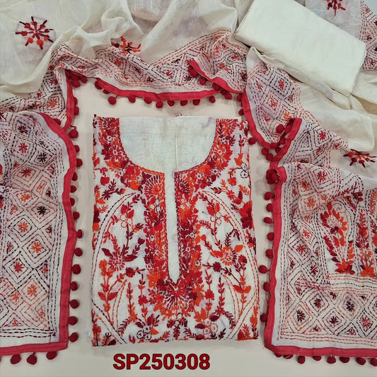 Designer half white premium silk cotton unstitched salwar material,(lining needed) V neck, maroon floral print, cut bead, zardozi work on daman, matching santoon bottom, bandhini printed silk cotton dupatta with lace tapings. NV250212