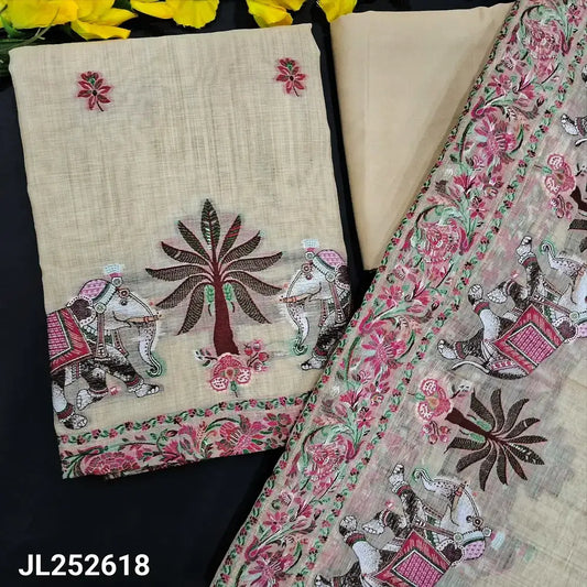 Rich beige premium linen kalamkari printed unstitched salwar material (textured, lining needed) rich hand embroidery work on daman, matching santoon bottom, kalamkari printed premium linen dupatta with rich embroidery. SP252105