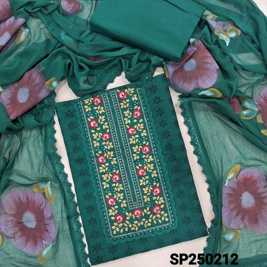 Dark Green schiffli embroidered cotton unstitched salwar material, embroidery& sequins work on yoke(lining needed) matching cotton bottom, brush painted fancy chiffon dupatta with lace tapings. DC250113