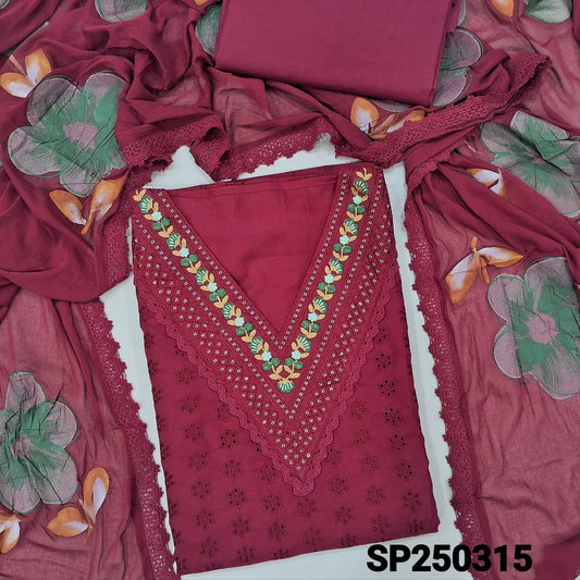 Reddish Maroon schiffli embroidered cotton unstitched salwar material, embroidery& sequins work on yoke(lining needed) matching cotton bottom, brush painted fancy chiffon dupatta with lace tapings. DC250112