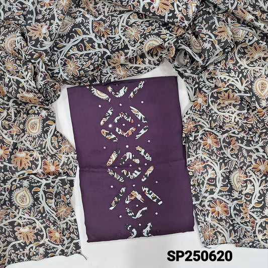 Digital printed Purple silk cotton unstitched salwar material (lining needed) sequins, bead work on yoke, dark green silk cotton bottom, digital printed silk cotton dupatta. NV253001