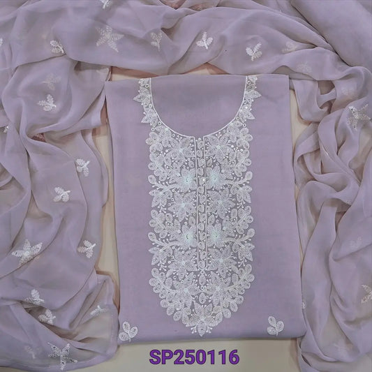Lavender premium georgette unstitched salwar material, embroidery& sequins work on yoke& front(thin, lining needed)matching santoon bottom, embroidered premium chiffon dupatta. CODE SP250116