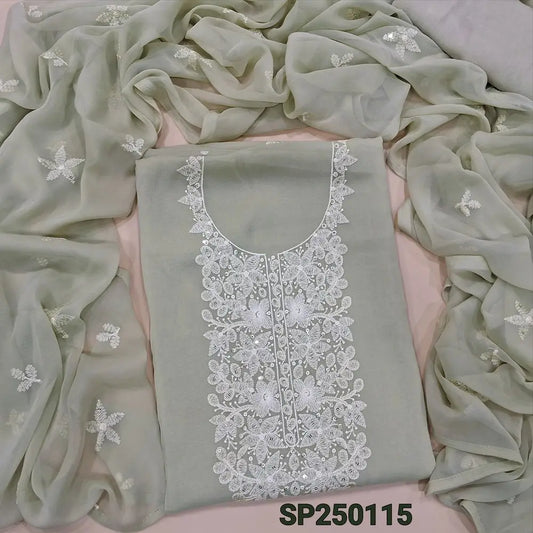 Light Bluish grey premium georgette unstitched salwar material, embroidery& sequins work on yoke& front(thin, lining needed)matching santoon bottom, embroidered premium chiffon dupatta.OC251522