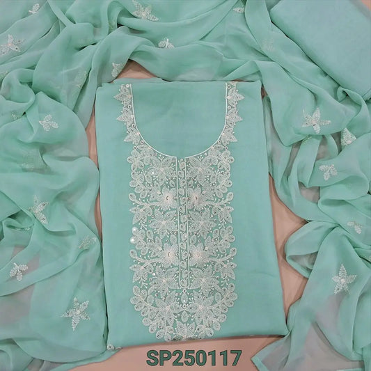 Pale green premium georgette unstitched salwar material, embroidery& sequins work on yoke& front(thin, lining needed)matching santoon bottom, embroidered premium chiffon dupatta. CODE SP250115