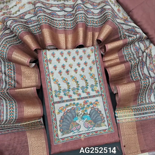 Dark peachish pink slub silk cotton unstitched salwar material,(textured, lining needed) digital print, zari buttas all over, matching spun cotton bottom, digital print, zari buttas on slub silk full length cotton dupatta. OC251206