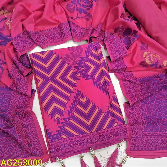Pink silk cotton unstitched salwar material,(thin, lining needed) digital printed on yoke, matching santoon bottom, digital printed silk cotton dupatta with tassels. OC251611