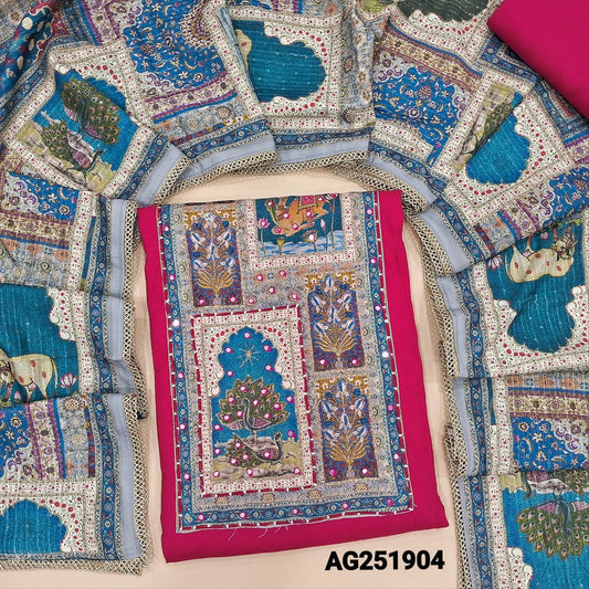 Dark onion pink silk cotton unstitched salwar material(thin, lining needed), digital printed, zardozi work on yoke, bead work on front, matching santoon bottom, madhubani printed silk cotton full length dupatta with lace tapings. OC250915