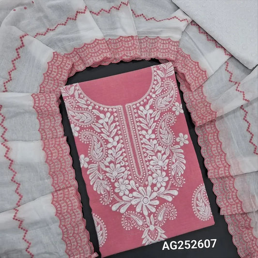Onion pink schiffli embroidered soft cotton unstitched salwar material, Embroidery work on V neckline (Thin, Lining Needed) matching cotton bottom, brush painted fancy chiffon dupatta with lace tapings. OC250711