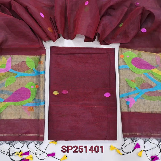 Reddish maroon jamdani woven premium tussar silk unstitched salwar material, (Thin, textured, lining needed) gold and silver zari weaving on daman, silk cotton bottom, full length jamdani woven tussar silk dupatta. OC253004