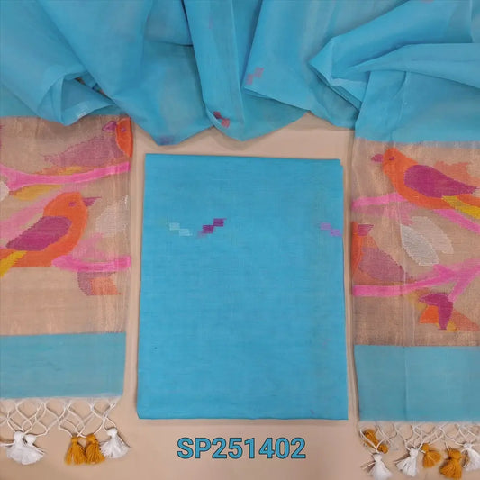 Turquoise Blue muslin jamdani unstitched salwar material, thread weaving on yoke& front(thin, lining needed)NO BOTTOM, muslin jamdani full length dupatta with gold tissue pallu& paithani weaving. DC250408