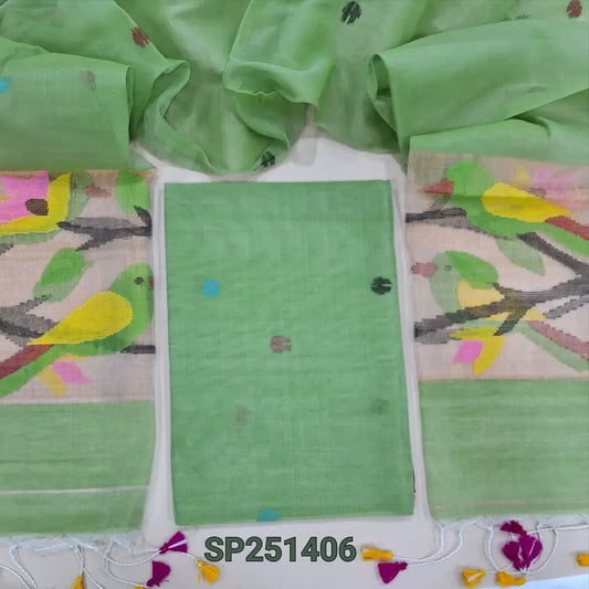 Parrot green premium raw silk unstitched salwar material (textured, Lining Needed) thread woven buttas all over, silver grey silk cotton bottom, original pen kalamkari silk dupatta with zari borders. NV251605