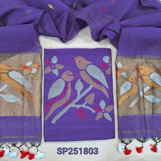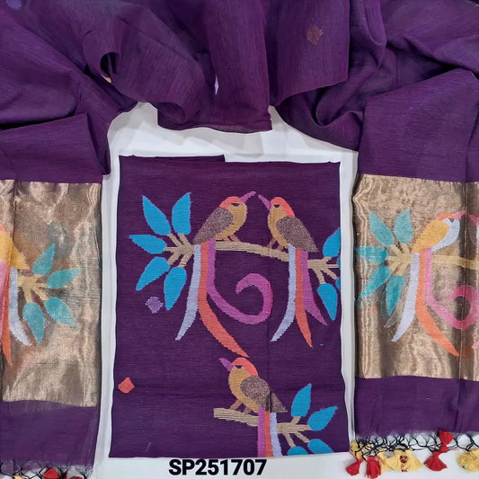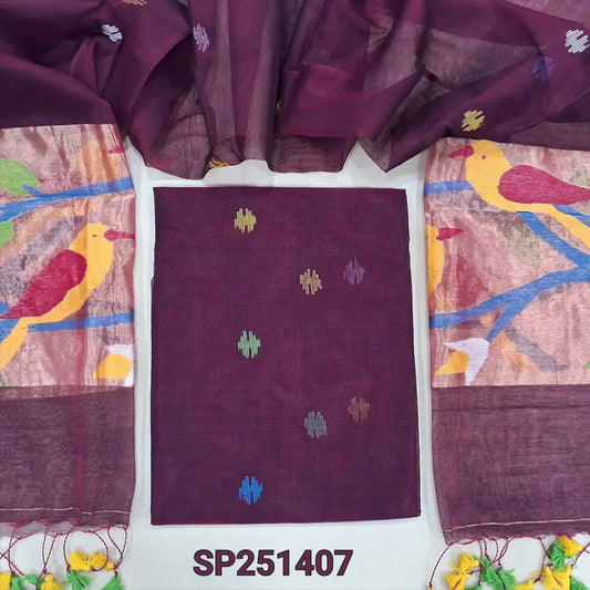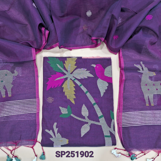 Violet muslin jamdani woven unstitched salwar material (Thin, Lightweight, Lining Needed) NO BOTTOM, floral weaving on top, full length jamdani woven dupatta with tissue pallu, handmade tassels. NV250803
