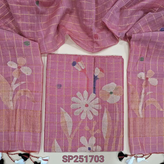 Pink jamdani woven premium tussar silk unstitched salwar material, (Thin, textured, lining needed) gold and silver zari weaving on daman, silk cotton bottom, full length jamdani woven tussar silk dupatta. OC253001