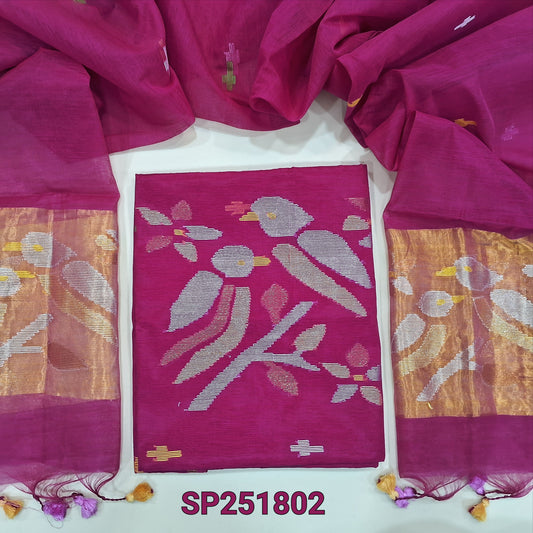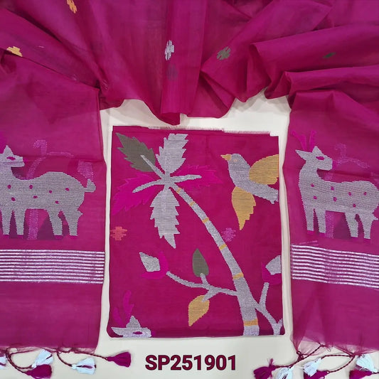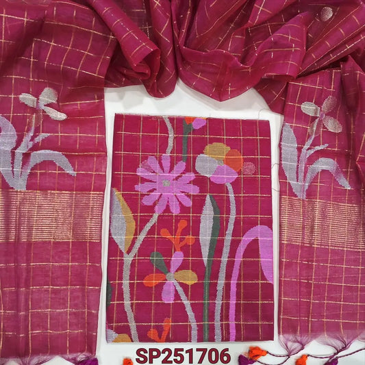 Dark pink Muslin jamdani unstitched salwar material, zari checks all over with thread weaving on daman(thin, lining needed)silver grey silk cotton bottom, muslin jamdani full length dupatta with tissue pallu & handmade tassels. NV251701