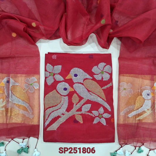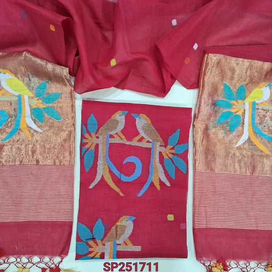 Bright Red muslin jamdani unstitched salwar material, hand woven design& zari checks all over(thin, lining needed)silver grey silk cotton bottom, muslin jamdani full length dupatta with zari checks& rich paithani weaning pallu. NV252101