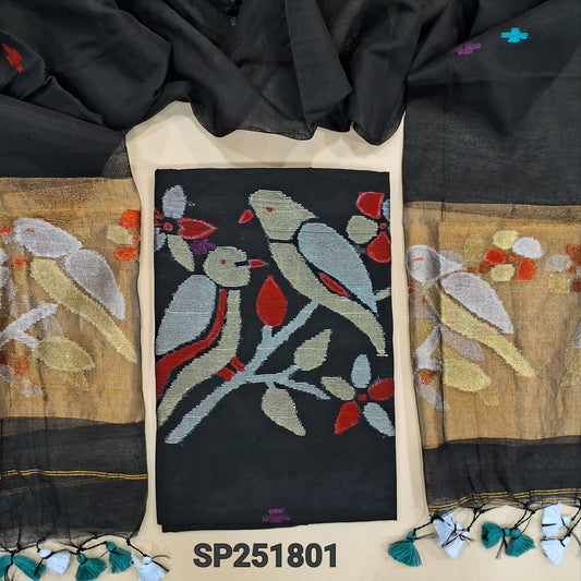 Designer Black Muslin Jamdani unstitched salwar material, Weaving yoke (Thin, Lining Needed) NO BOTTOM, Jamdani woven full length dupatta with paithani weaving on pallu and handmade tassels. NV250102
