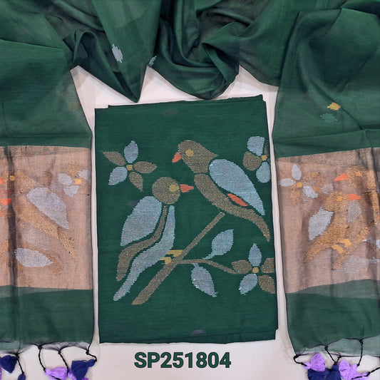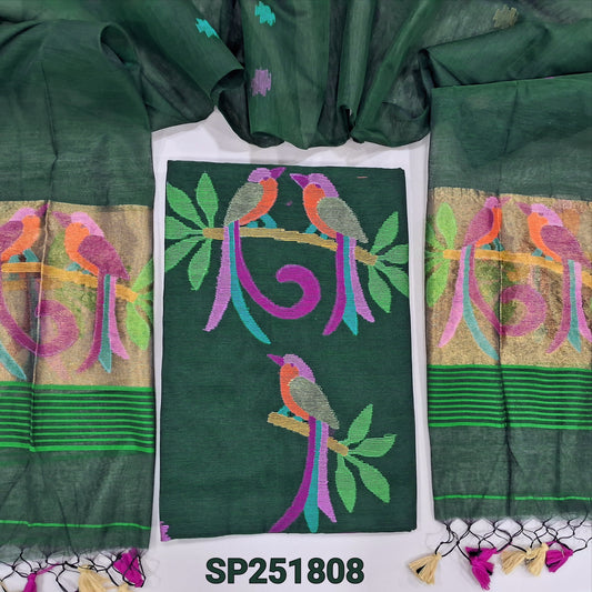 Dark Green designer muslin jamdani unstitched salwar material, hand woven design& zari checks all over(thin, lining needed)NO BOTTOM, muslin jamdani full length dupatta with zari checks& rich paithani weaning pallu. OC252702