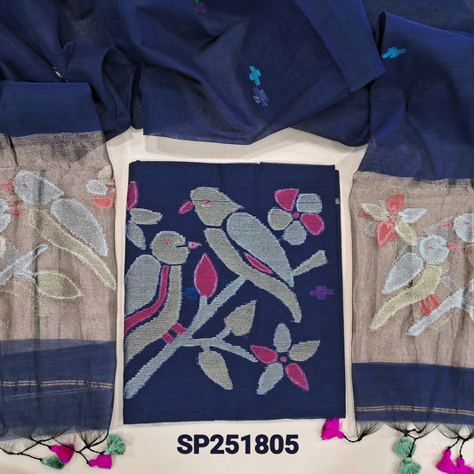 Dark Blue designer muslin jamdani unstitched salwar material, hand woven design& zari checks all over(thin, lining needed)NO BOTTOM, muslin jamdani full length dupatta with zari checks& rich paithani weaning pallu. OC252703