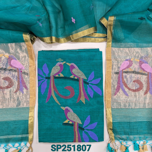 Teal Green muslin jamdani woven unstitched salwar material (Thin, Lightweight, Lining Needed) NO BOTTOM, floral weaving on top, full length jamdani woven dupatta with tissue pallu, handmade tassels. NV250802
