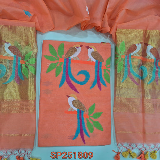 Designer Light Orange Muslin Jamdani unstitched salwar material, Weaving yoke (Thin, Lining Needed) NO BOTTOM, Jamdani woven full length dupatta with paithani weaving on pallu and handmade tassels. NV250103