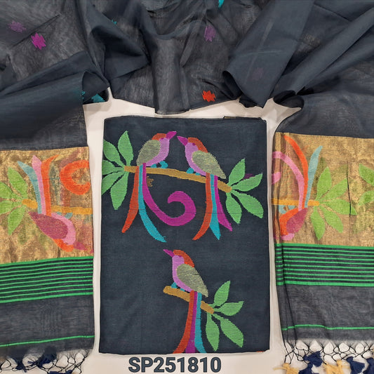 Bottle green Muslin jamdani unstitched salwar material, zari checks all over with thread weaving on daman(thin, lining needed)silver grey silk cotton bottom, muslin jamdani full length dupatta with tissue pallu & handmade tassels. NV251702