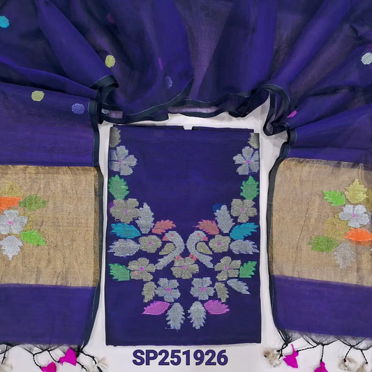 Dark blue Muslin jamdani unstitched salwar material, zari checks all over with thread weaving on daman(thin, lining needed)silver grey silk cotton bottom, muslin jamdani full length dupatta with tissue pallu & handmade tassels. NV251703