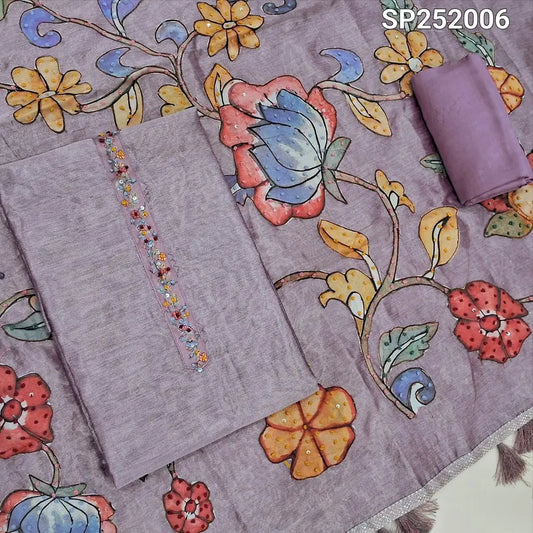 Digital printed Mauve semi gicha unstitched salwar material(textured, lining needed) digital print on yoke, faux mirror work on front, matching spun cotton bottom, digital print semi gicha full length dupatta. Dc250522