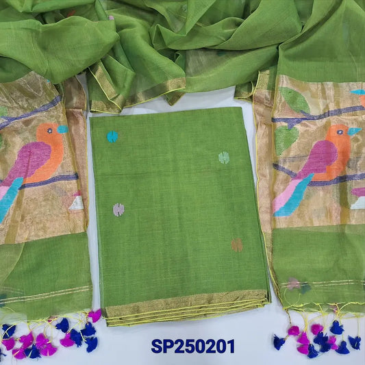 Mossy Green silk cotton unstitched salwar material(lining needed) heavy benaras woven on yoke, zari woven buttas allover, matching silk cotton bottom, rich benaras weaving silk cotton dupatta with tassels. DC250418