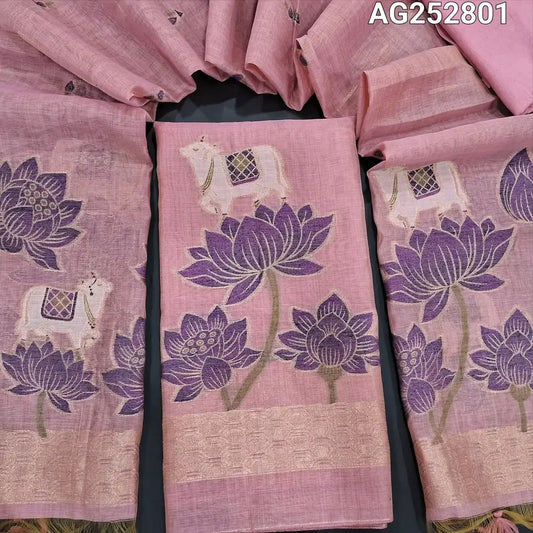 Benarasi woven Pink soft silk cotton unstitched salwar material(lining needed) heavy benarasi woven design allover, matching silk cotton bottom, zari lines on silk cotton dupatta with copper tissue pallu & tassels. DC250302