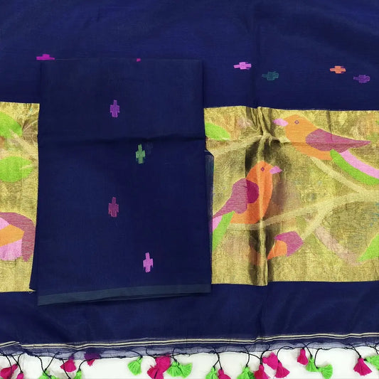Dark blue premium silk cotton unstitched salwar material(thin, lining needed)jamdani weaving all over, matching silk cotton bottom, jamdani woven full length premium silk cotton dupatta with borders. NV252004