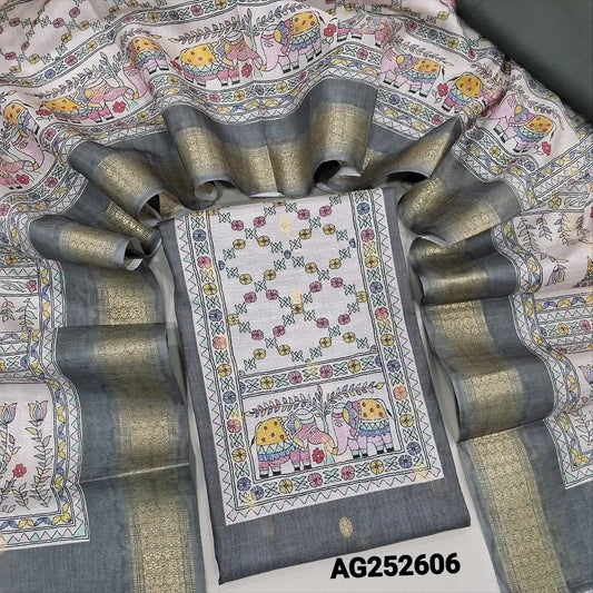 Light Grey digital printed silk cotton unstitched salwar material,(thin, lining needed) madhubani print on yoke, zari lines allover, matching silky bottom, madhubani printed silk cotton dupatta. OC252917
