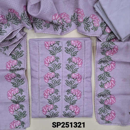 Light purple fancy kota silk cotton unstitched salwar material (lining needed) cross stitch embroidery work on yoke, matching silky bottom, embroidery work on kota silk cotton dupatta. NV251119