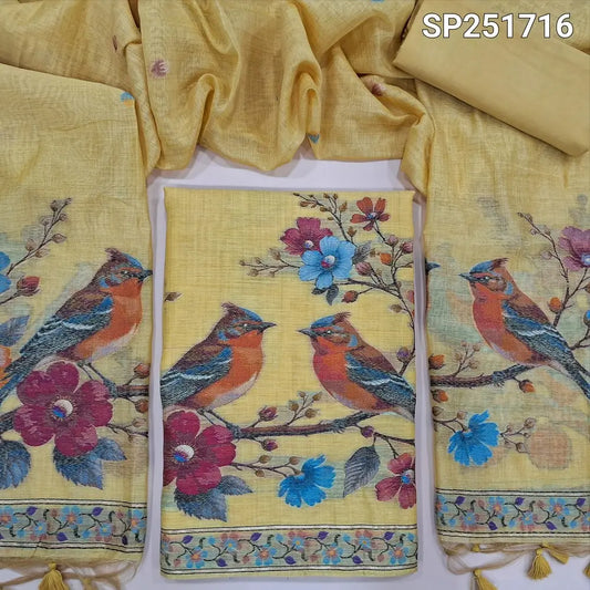 Yellow digital printed slub silk cotton unstitched salwar material, rich daman with handwork (Textured, Thin, Lining Needed) Matching bottom, Digital Printed Short Width Dupatta. OC250316