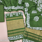 Original batik dyed turquoise Greene fancy silk cotton unstitched salwar material(lining needed) tissue borders on daman, matching silky bottom, batik dyed fancy silk cotton dupatta with tissue border on pallu, pompom tapings. DC250208