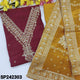 Beetroot purple designer pure maslin silk unstitched salwar material, v neck with zari& sequins work, sequins work on front(lining needed)mehandhi yellow silk cotton bottom, premium tissue silk short width dupatta with zari weaving. CODE SP242303
