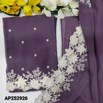 Light beetroot purple semi georgette unstitched salwar material, cut work on daman(thin fabric, lining needed)matching silky fabric provided for both bottom& lining, semi georgette full length dupatta with embroidered& cut work edges. CODE AP252925