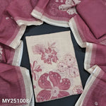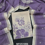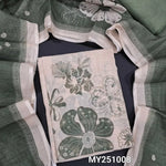 Beige base floral printed semi linen unstitched salwar material, zari& real mirror work on yoke(thin fabric, lining needed)teal blue santoon bottom, digital printed semi linen dupatta. Code MY251005