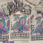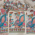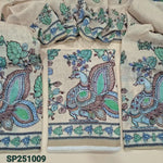 Beige designer premium linen unstitched salwar material, yellow kalamkari printed with rich thread work on front(thin, lining needed)matching santoon bottom, kalamkari printed short width dupatta with hand embroidey. CODE SP251010