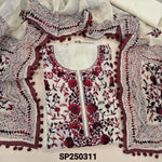 Light beige designer premium silk cotton unstitched salwar material, heavy hand embroidery on front(lining needed)matching santoon bottom, rich hand embroidered premium silk cotton dupatta with pompom tapings. CODE SP250310