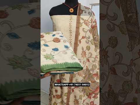 Beige with golden tint digital printed tissue linen unstitched salwar material, hand embroidered on yoke& front(thin, lining needed)blue santoon bottom, kalamkari printed tissue linen dupatta. CODE JL253105